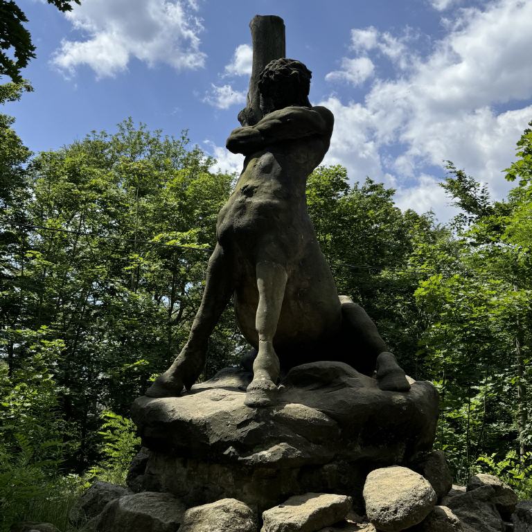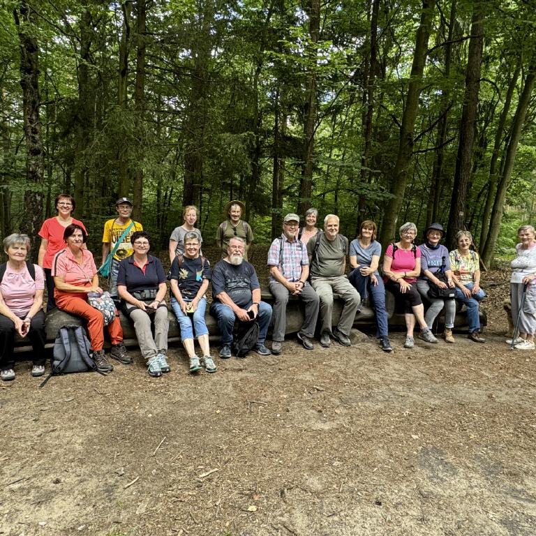 Auf ging es über Stock und Stein zum Wolfshügel. Der Wolfshügelturm ist leider nur noch eine Ruine, aber von hier aus hatte man einen herrlichen Fernblick ins Elbtal. Unser Weg führte uns über ein Bächlein zum Kentauer oder Zentaur-Chiron Skulptur, also ein Pferde-Menschenkörper friedlich dreinschauend. Nach kurzer Rast ging es weiter zur Napoleonschanze, bei guter Sicht kann man bis Bannewitz schauen und das hatten wir. Der nächste Höhepunkt der Wanderung war die Schwesternquelle, einige unserer Clubmitglieder stiegen die steile Treppe zur Quelle hinab , die anderen warteten auf der Brücke. Nach der Inspektion der Quelle ging es auf zur vorletzten Etappe zum Rastplatz mit den liegenden Holzskulpturen, die aus einem Stamm mit der Kettensäge geschnitzt wurden. Nach einer Ruhepause ging es wieder zurück zum Ausgangspunkt, 8km sind wir gewandert. Für einige war es noch nicht genug und wir wanderten noch in den Biergarten vom Waldschlößchen, wo wir bei einem kühlen Bierchen den Tag ausklingen liesen. Wanderung 2024