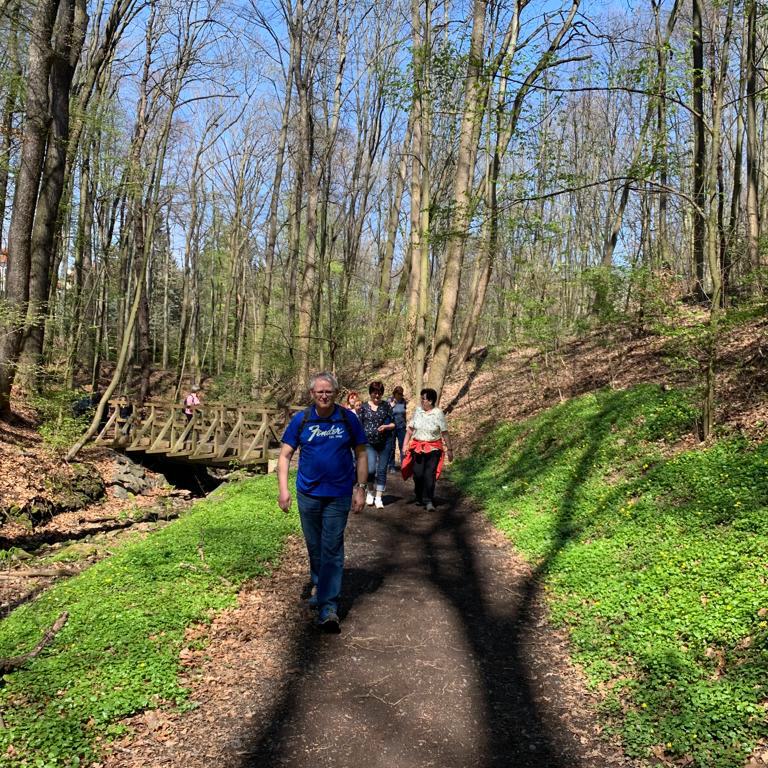 Auf ging es über Stock und Stein zum Wolfshügel. Der Wolfshügelturm ist leider nur noch eine Ruine, aber von hier aus hatte man einen herrlichen Fernblick ins Elbtal. Unser Weg führte uns über ein Bächlein zum Kentauer oder Zentaur-Chiron Skulptur, also ein Pferde-Menschenkörper friedlich dreinschauend. Nach kurzer Rast ging es weiter zur Napoleonschanze, bei guter Sicht kann man bis Bannewitz schauen und das hatten wir. Der nächste Höhepunkt der Wanderung war die Schwesternquelle, einige unserer Clubmitglieder stiegen die steile Treppe zur Quelle hinab , die anderen warteten auf der Brücke. Nach der Inspektion der Quelle ging es auf zur vorletzten Etappe zum Rastplatz mit den liegenden Holzskulpturen, die aus einem Stamm mit der Kettensäge geschnitzt wurden. Nach einer Ruhepause ging es wieder zurück zum Ausgangspunkt, 8km sind wir gewandert. Für einige war es noch nicht genug und wir wanderten noch in den Biergarten vom Waldschlößchen, wo wir bei einem kühlen Bierchen den Tag ausklingen liesen. Wanderung 2024